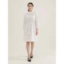 Dress menghadirkan potongan clean dengan detail scarf collar dan tali pinggang bertassel, menciptakan tampilan yang elegan namun effortless. Terbuat dari bahan katun ringan yang lembut di kulit dan nyaman dipakai seharian.