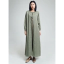 Long dress textured ini menjadi pilihan sempurna untuk tampilan modest yang clean dan menenangkan. Warna sage grey yang lembut memberikan kesan calm sekaligus modern.