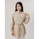 Tunik bermotif abstrak bernuansa earthy tone yang memberikan kesan lembut, hangat, dan elegan. Dilengkapi tali serut yang dapat disesuaikan untuk membentuk siluet tubuh secara lebih proporsional.