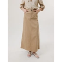 Rok panjang ini memiliki potongan lurus jatuh dengan detail kancing dan resleting depan, memberikan kesan rapi namun tetap nyaman untuk aktivitas harian.