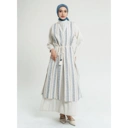 Dress Ibu : Dress panjang lengan panjang dengan vest luar motif garis vertikal warna putih-biru, dilengkapi tali pinggang adjustable yang memberi kesan rapi dan elegan.