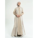 Dress Ibu : Dress panjang warna cream bermotif lembut dengan aksen pita di kerah dan ruffle bawah yang memberi kesan anggun dan elegan.
