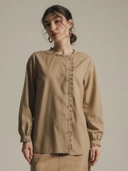 Blouse wanita dengan desain feminin dan elegan yang memberikan tampilan anggun namun tetap modern. Hadir dalam warna khaki yang netral, dilengkapi aksen ruffle di bagian depan yang menjadi statement menarik pada tampilan.